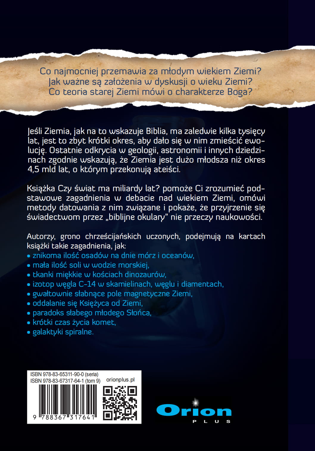 Jeśli Ziemia, jak na to wskazuje Biblia, ma zaledwie kilka tysięcy lat, jest to zbyt krótki okres, aby dało się w nim zmieścić ewolucję. Ostatnie odkrycia w geologii, astronomii i innych dziedzinach zgodnie wskazują, że Ziemia jest dużo młodsza niż okres 4,5 mld lat, o którym przekonują ateiści. Książka „Czy świat ma miliardy lat?” pomoże Ci zrozumieć podstawowe zagadnienia w debacie nad wiekiem Ziemi, omówi metody datowania z nim związane i pokaże, że przyjrzenie się świadectwom przez „biblijne okulary” nie przeczy naukowości