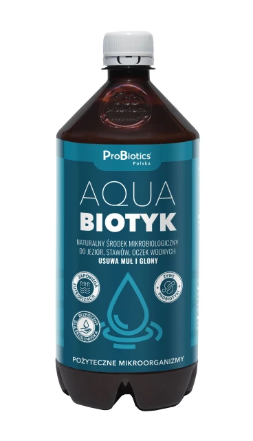 AQUABIOTYK to płynny, mikrobiologiczny środek pochodzenia naturalnego, przeznaczony do stosowania w zbiornikach wodnych: jeziorach, stawach, oczkach i ciekach wodnych. Zawiera pożyteczne mikroorganizmy, które żywią się materią organiczną zalegającą na dnie zbiornika. Przyspieszają one jej mineralizację i zatrzymują procesy gnilne.