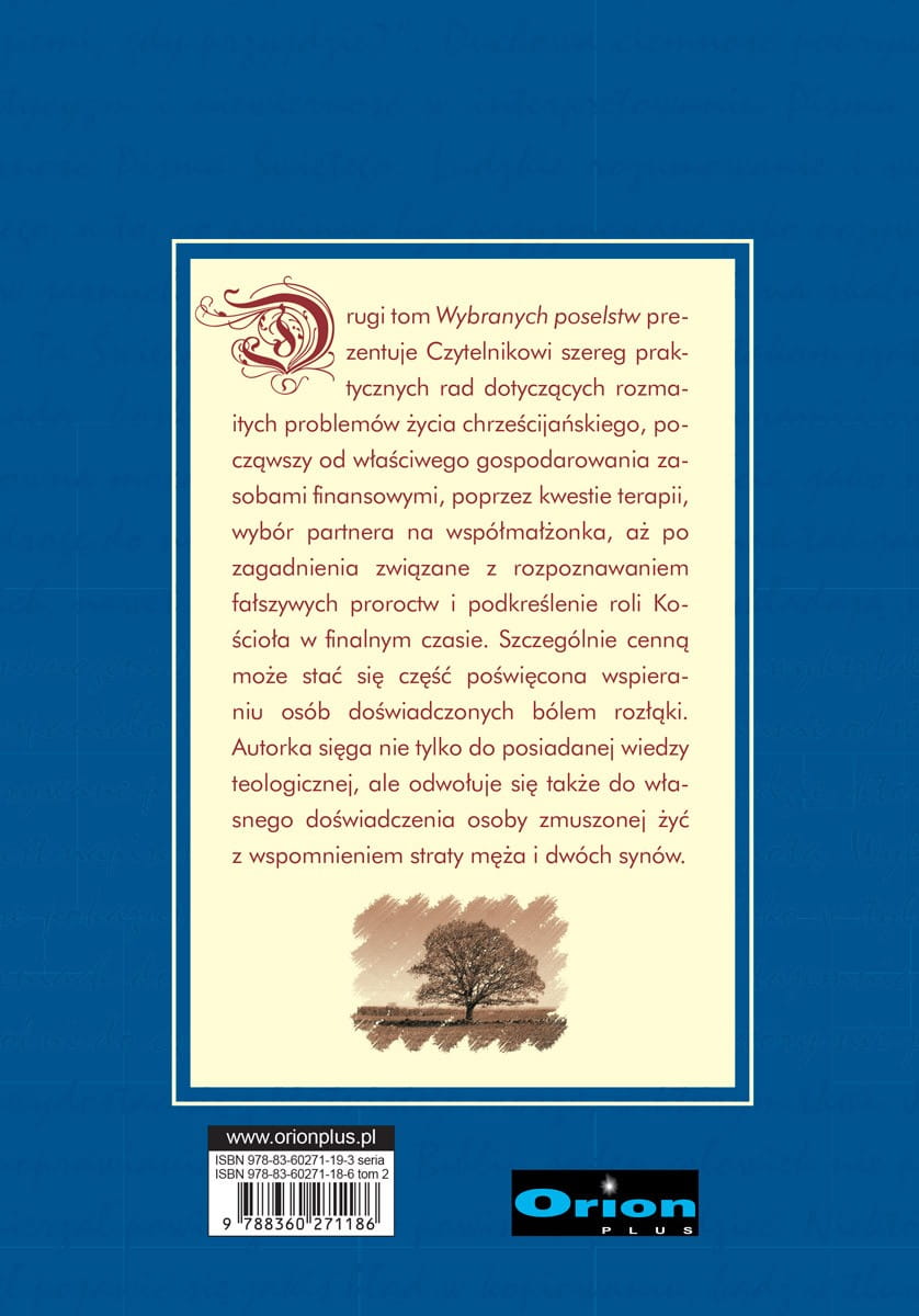 Drugi tom Wybranych poselstw prezentuje Czytelnikowi szereg praktycznych rad dotyczących rozmaitych problemów życia chrześcijańskiego, począwszy od właściwego gospodarowania zasobami finansowymi, poprzez kwestie terapii, wybór partnera na współmałżonka, aż po zagadnienia związane z rozpoznawaniem fałszywych proroctw i podkreślenie roli Kościoła w finalnym czasie. Szczególnie cenną może stać się część poświęcona wspieraniu osób doświadczonych bólem rozłąki. Autorka sięga nie tylko do posiadanej wiedzy teologicznej, ale odwołuje się także do własnego doświadczenia osoby zmuszonej żyć z wspomnieniem straty męża i dwóch synów.