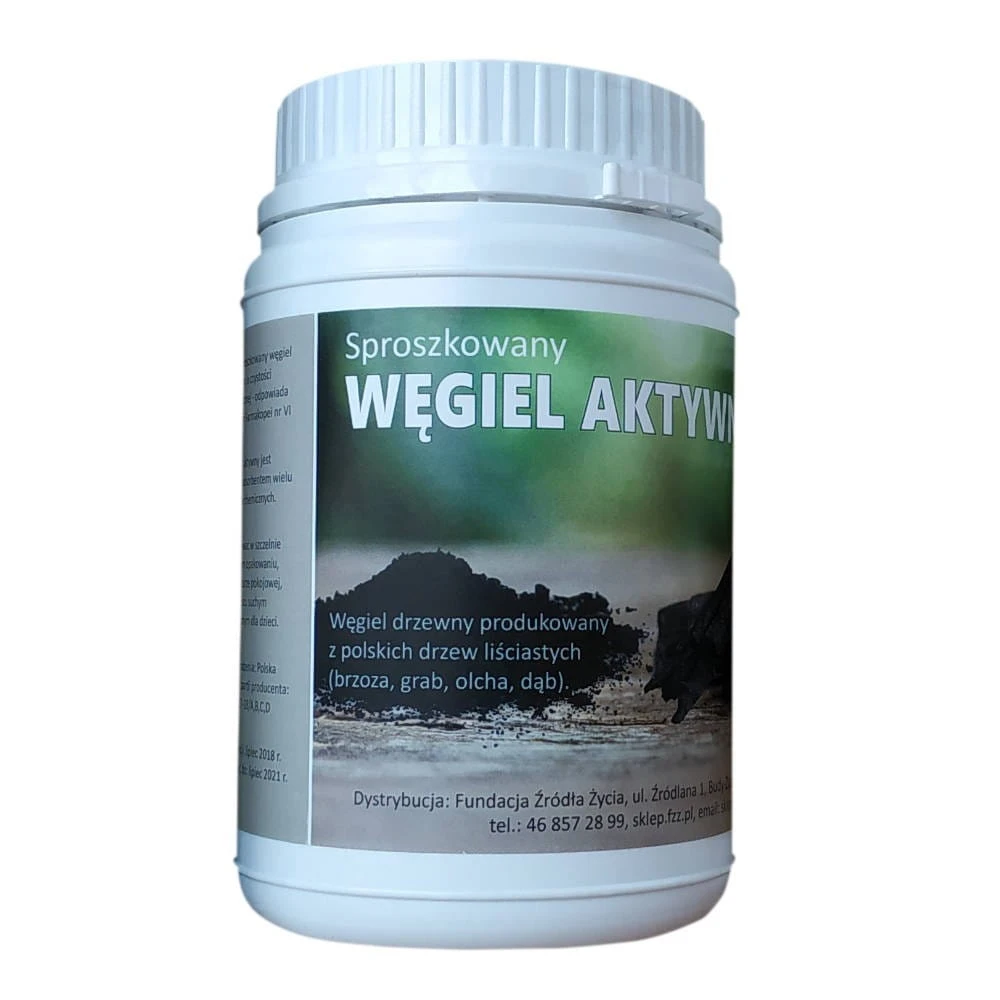 Węgiel drzewny produkowany z drzew liściastych (brzoza, grab, olcha, dąb). Węgiel aktywny jest doskonałym adsorbentem wielu związków chemicznych. Przechowywać w szczelnie zamkniętym opakowaniu, w temperaturze pokojowej, w miejscu suchym i niedostępnym dla dzieci. Kraj pochodzenia: Polska. Waga 500 gram.